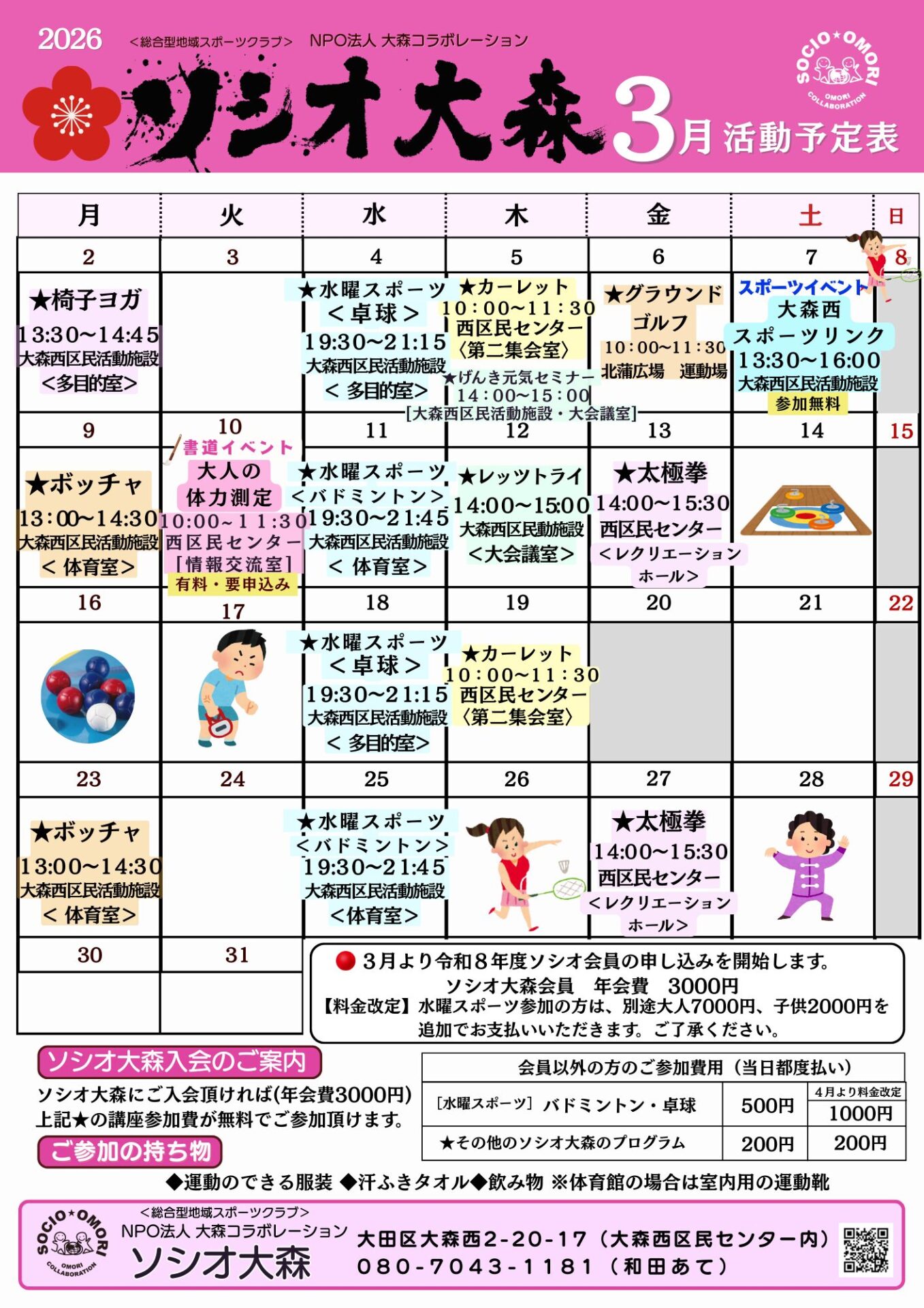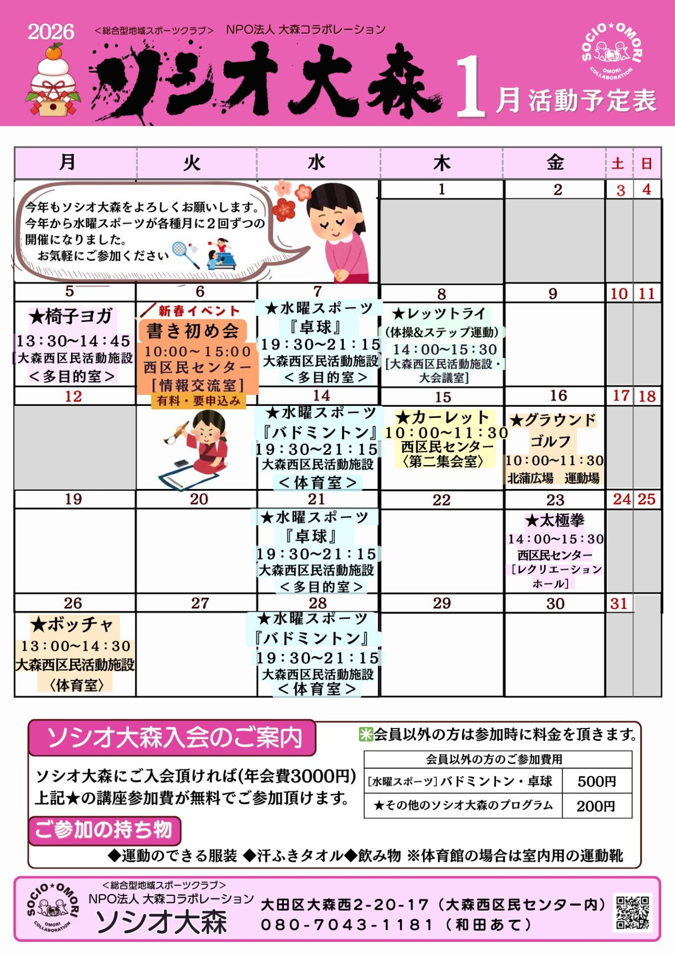 - 新春 書初め会開催のお知らせ2026年1月6日(火)にソシオ大森主催の新春書初め会を開催いたします。用具はこちらで全て手配いたし… 続きを読む: 新春 書初め会開催のお知らせ
