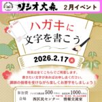 - 書道イベント『ハガキに文字を書こう』のお知らせ2月17日(火)に西区民センター情報交流室にて、書道イベント『ハガキに文字を書こう』を行います。用具… 続きを読む: 書道イベント『ハガキに文字を書こう』のお知らせ