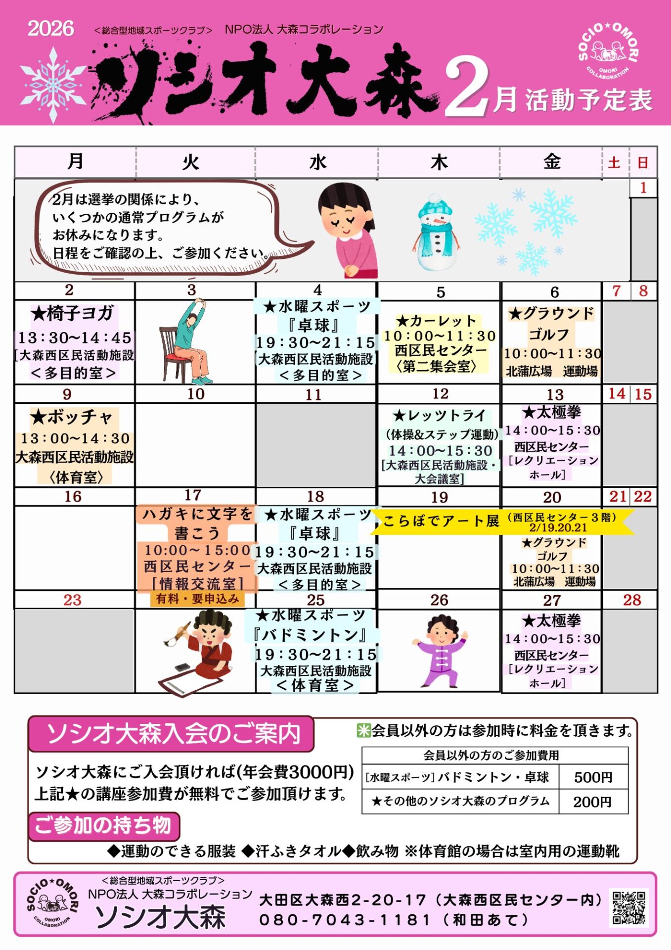 - 2026年度2月のプログラムカレンダーのご案内2026年2月のソシオ大森のプログラムカレンダーをご案内いたします。2月は都合により急遽お休みとなる… 続きを読む: 2026年度2月のプログラムカレンダーのご案内