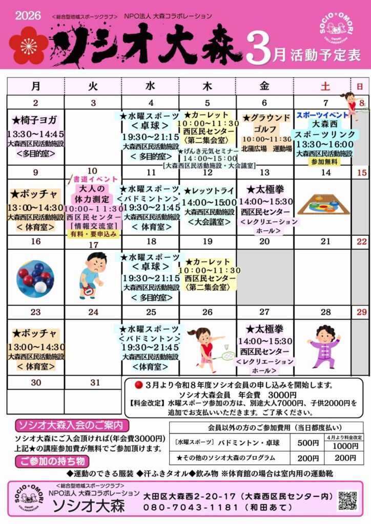 2026年3月のソシオ大森のプログラムカレンダーをご案内いたします。