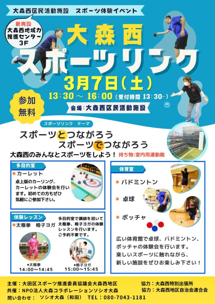 3月7日にソシオ大森共催のスポーツ体験会イベント「スポーツリンク」が開催されます。