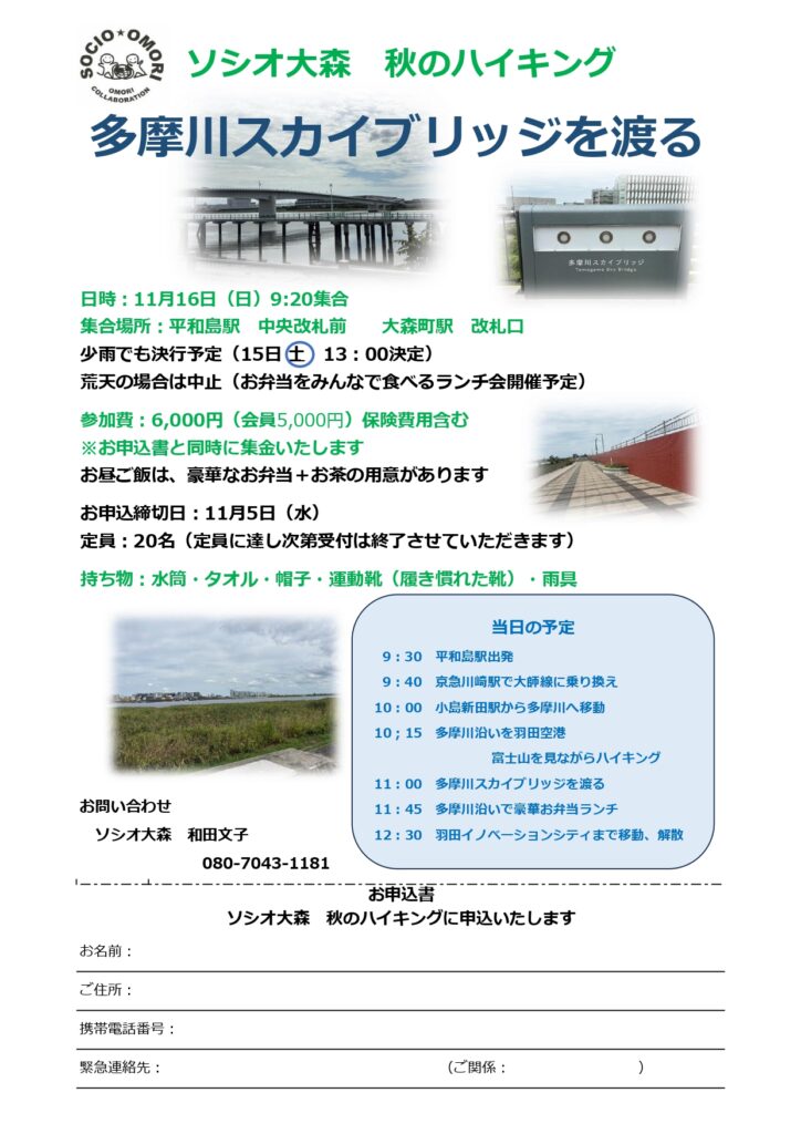 11月16日(日)にソシオ大森の秋のハイキングとして多摩川ブリッジを渡るハイキングを行います。