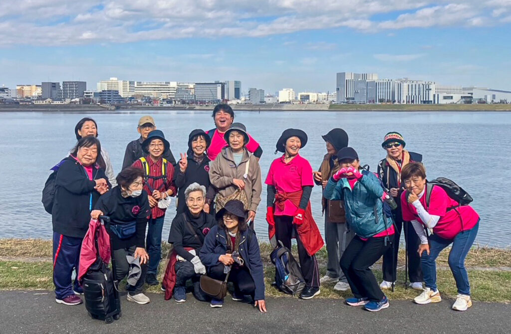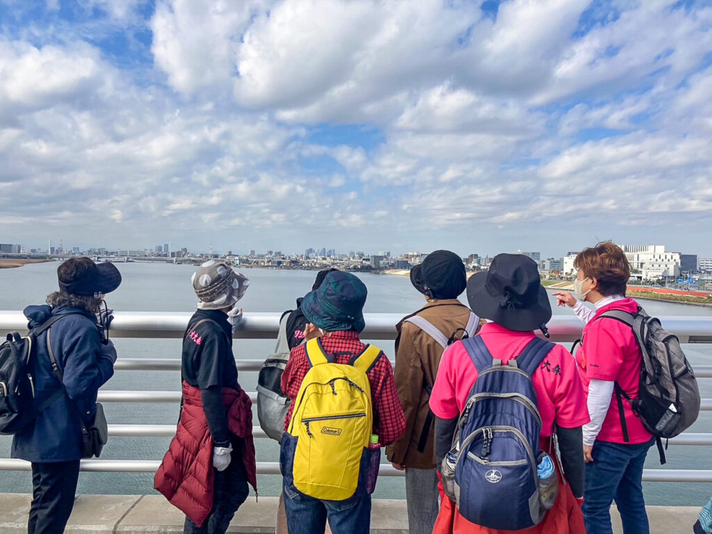 京浜急行小島新田駅に集合後、皆さんと多摩川に向かい、川崎側の土手歩きを開始しました。多摩川を越えて見えるのは、東京タワー・東京スカイツリー・東京モノレール。